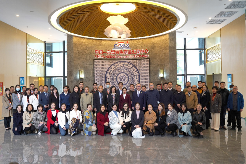 東博會秘書處對外聯絡部部長肖瀟,廣西新中產業(yè)投資有限公司副總經理商紅,中國—東盟特色商品匯聚中心副總經理盧春梅等相關領導出席掛牌儀式并陪同參觀匯聚中心主題展館。